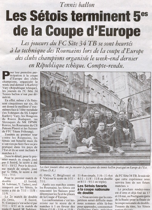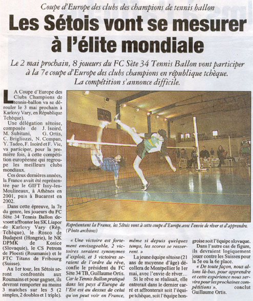 Les deux années précédentes, c'était le GIFT Issy-les-Moulineaux qui avait représenté la France dans cette compétition, à Athènes en 2001, puis à Bucarest en 2002. Dans cette compétition, les 6 meilleurs clubs européens se sont retrouvés à Karlovy Vary (Rép. Tchèque) pour la 7e compétition de ce genre, regroupant ce qui se fait de mieux dans le monde du Tennis Ballon européen. -